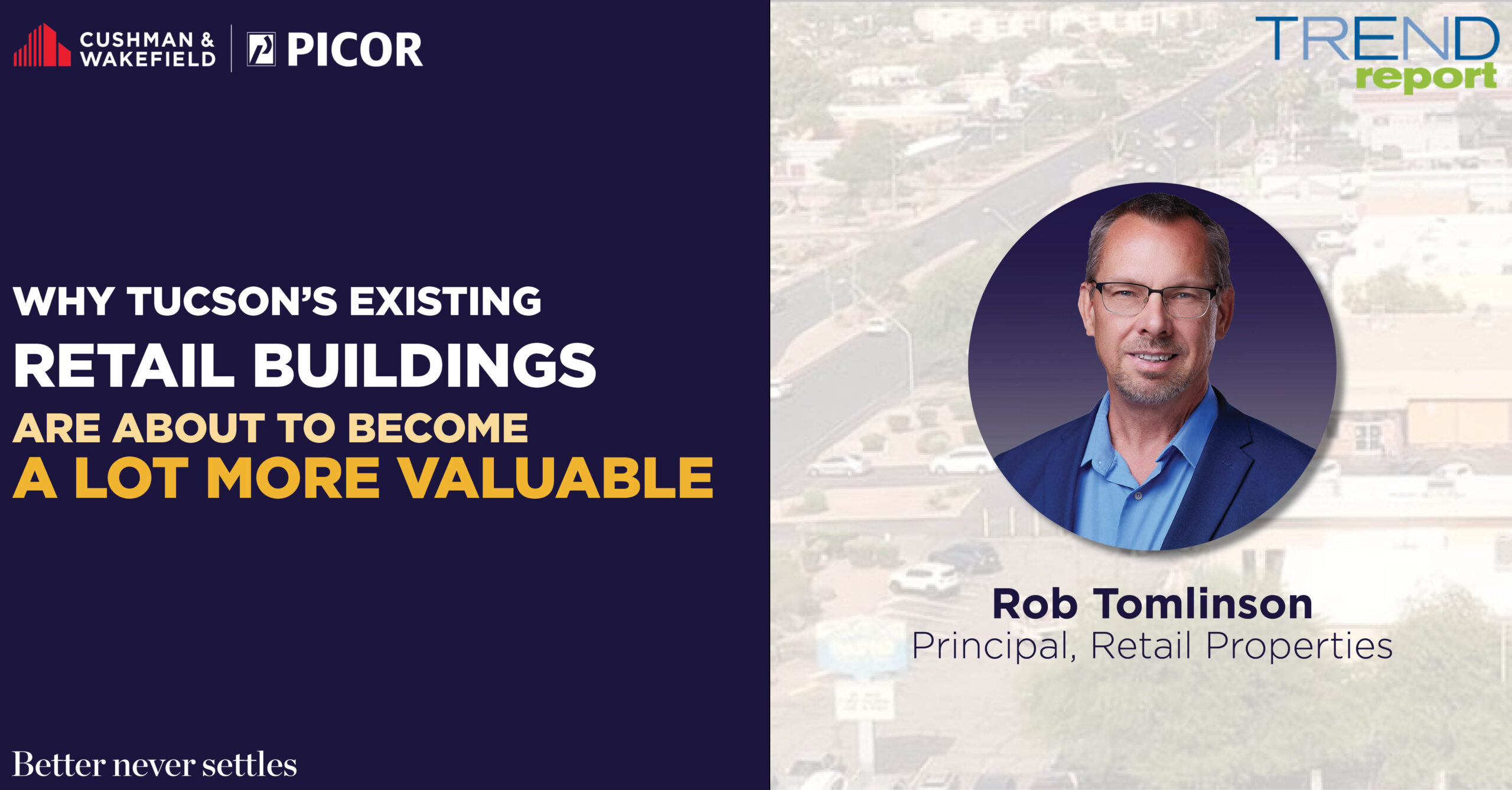 “A one-story strip center on a major corridor is no longer just a retail asset. It is now potentially a mixed use development site…If you own a retail building in Tucson’s urban core, you may be sitting on more value than you realize”, said Rob Tomlinson, Principal and Retail Specialist at Cushman & Wakefield | PICOR….