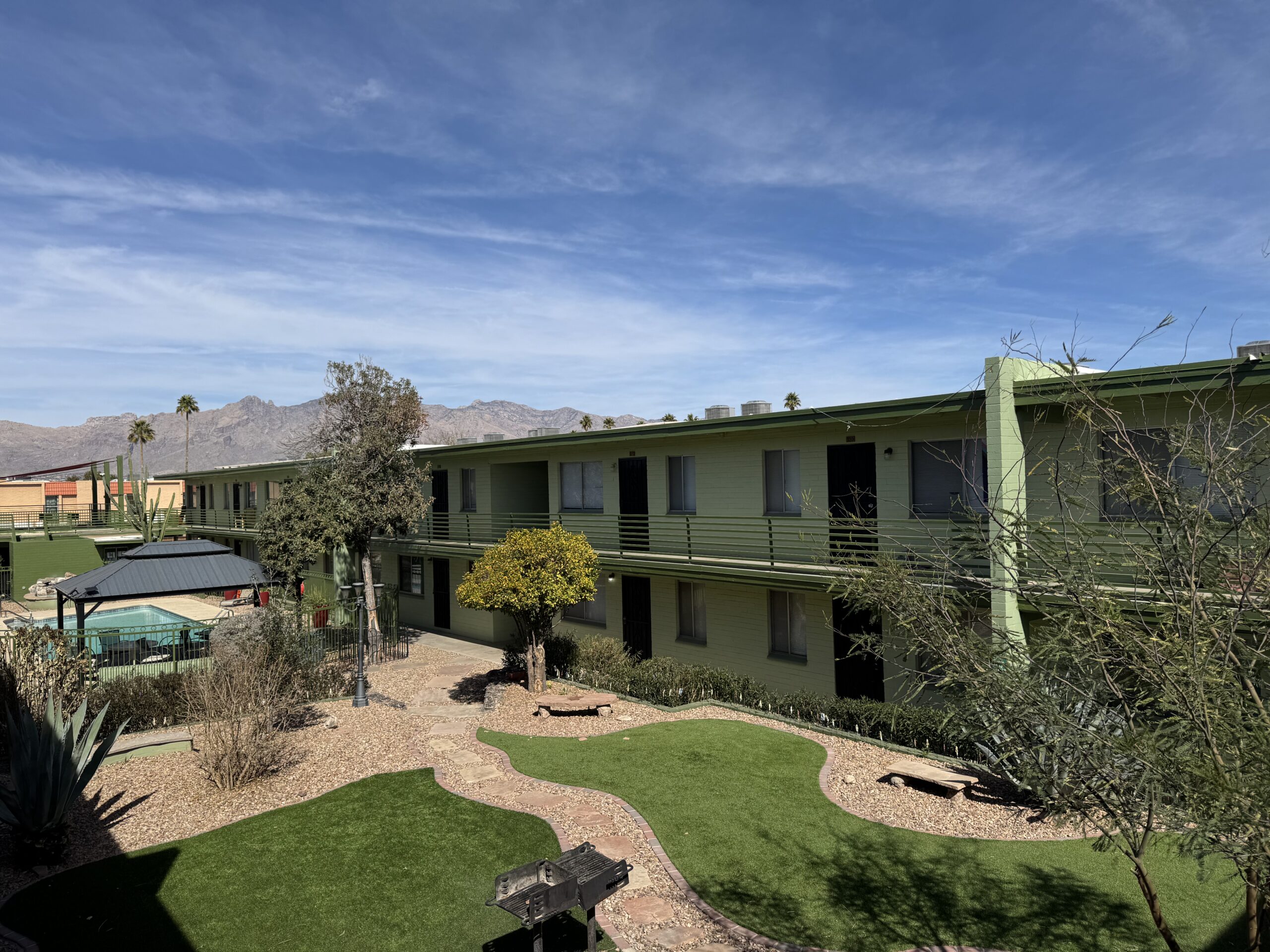 The complex includes on-site laundry, assigned covered parking, a sparkling pool, and landscaped courtyards with artificial turf, desert plants, and mature shade trees—all set against the view of the Catalina Mountains. Select units have undergone interior upgrades, including modernized kitchens with new cabinetry, tile backsplash, updated flooring, and refreshed bathrooms. Two-bedroom units feature full air conditioning and upgraded electrical panels, while one-bedroom units still operate on evaporative cooling—presenting value-add potential for new ownership.