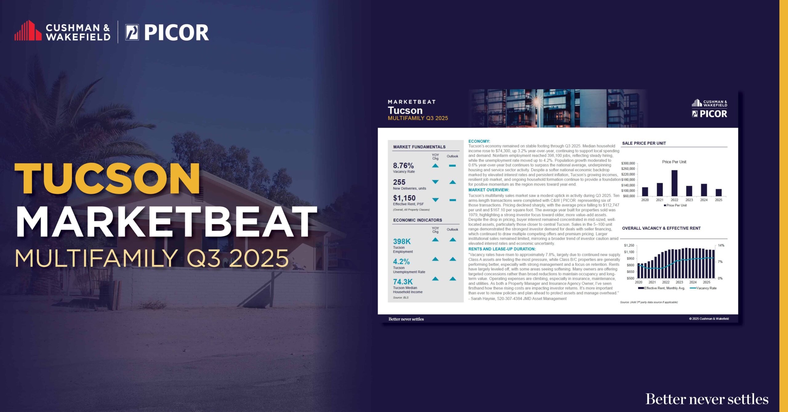 Tucson’s multifamily sales market saw a modest uptick in activity during Q3 2025. Ten arms-length transactions were completed with C&W | PICOR representing six of those transactions. Pricing declined sharply, with the average price falling to……