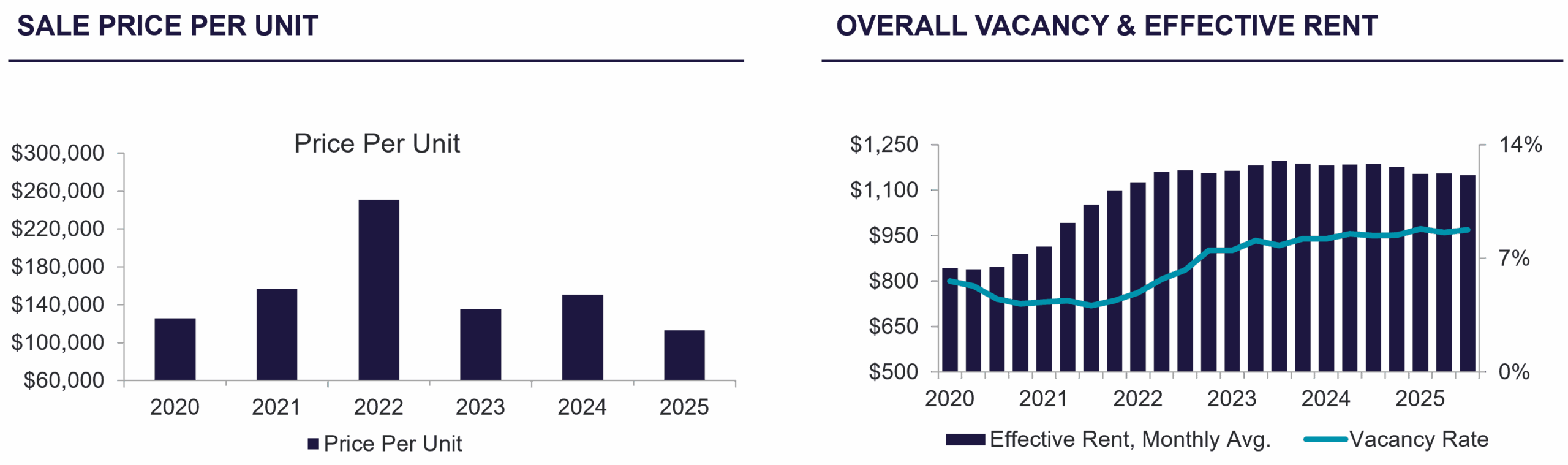 Tucson’s multifamily sales market saw a modest uptick in activity during Q3 2025. Ten arms-length transactions were completed with C&W | PICOR representing six of those transactions. Pricing declined sharply, with the average price falling to $112,747 per unit and $167.10 per square foot. The average year built for properties sold was 1979, highlighting a strong investor focus toward older, more value-add assets. Despite the drop in pricing, buyer interest remained concentrated in mid-sized, well-located assets, particularly those closer to central Tucson. Sales in the 5–100 unit range demonstrated the strongest investor demand for deals with seller financing, which continued to draw multiple competing offers and premium pricing. Larger institutional sales remained limited, mirroring a broader trend of investor caution amid elevated interest rates and economic uncertainty.